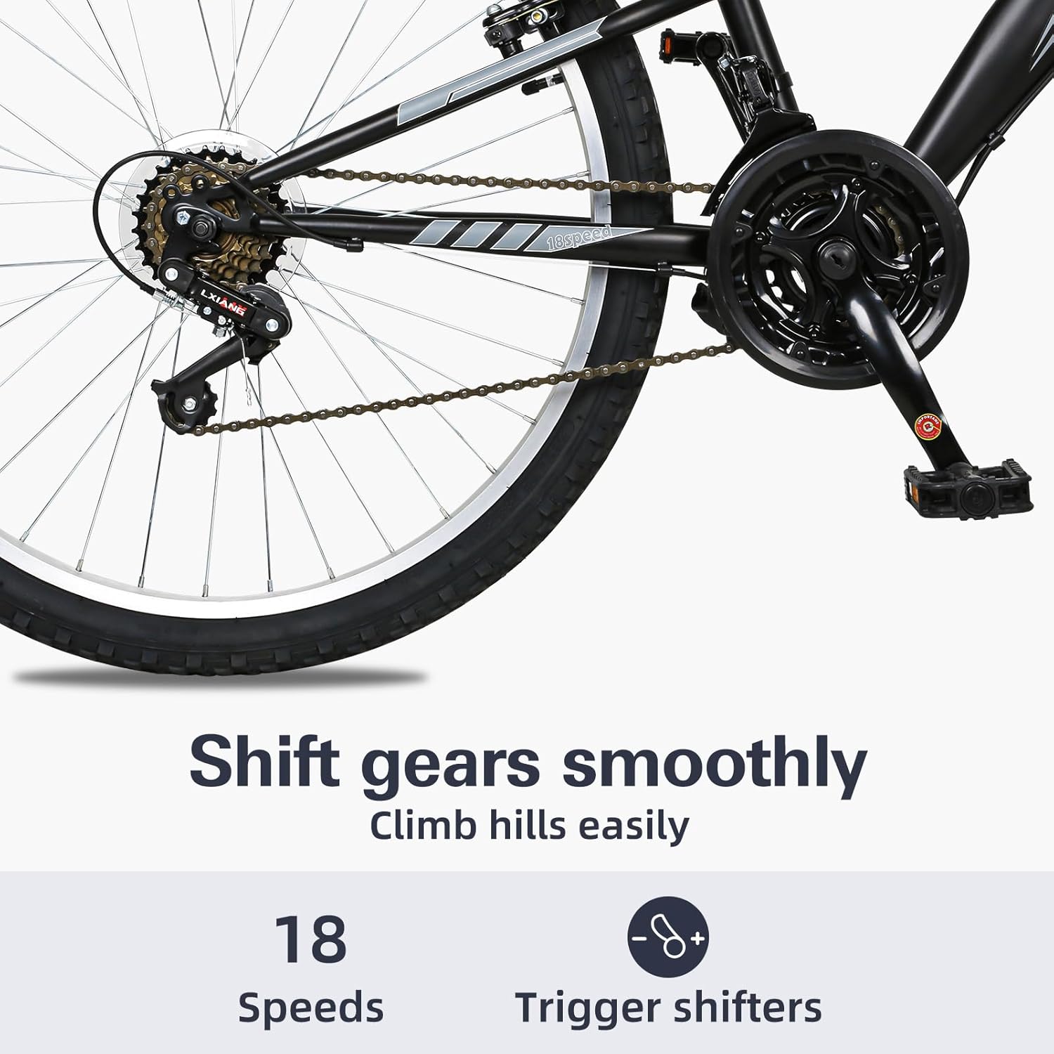 Constructed with a high-carbon steel frame and dual full suspension, this bike offers a smooth and comfortable ride on all types of terrain. The 18-speed gearing system allows you to conquer hills and rough trails with ease, while the adjustable ergonomic seat ensures a customized fit for maximum comfort.