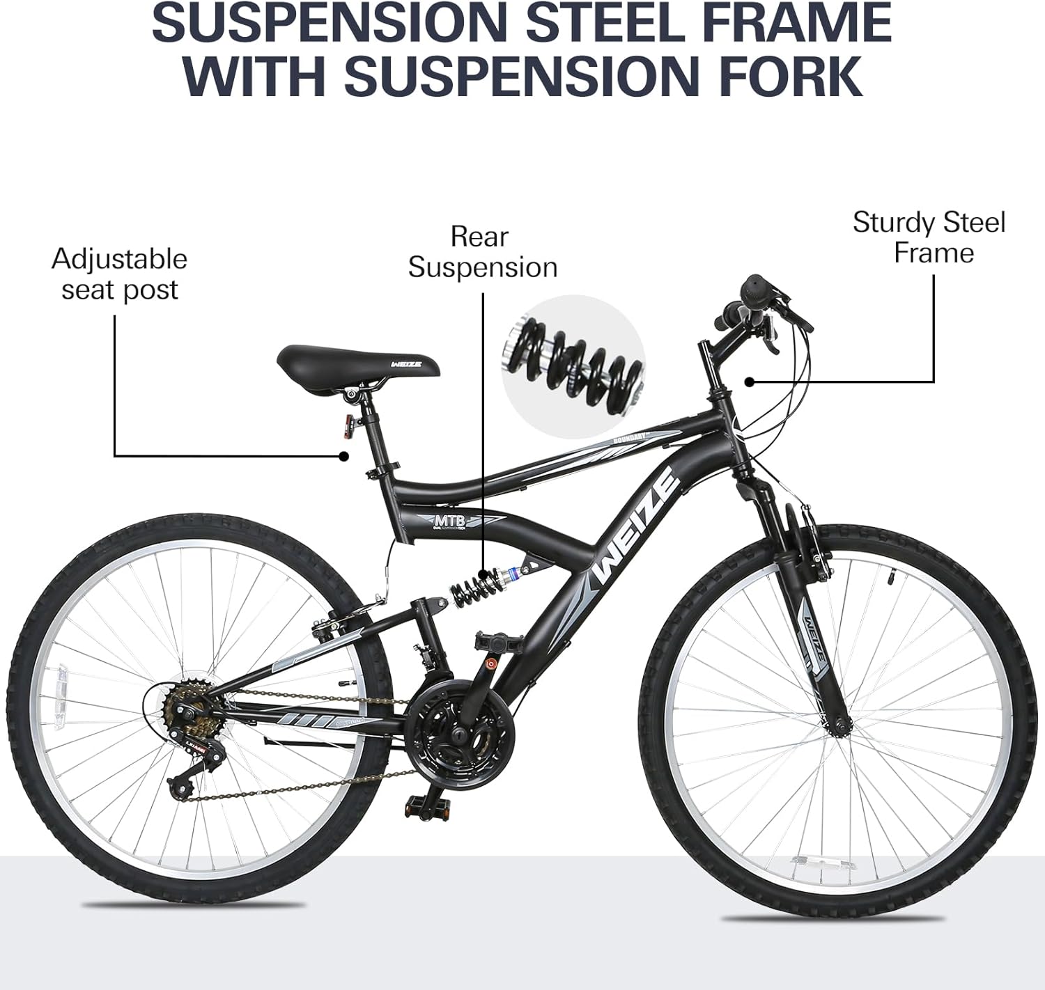 WEIZE Mountain Bike, 24/26/27.5 inch Outdoor Cycling Bike,18-Speed/High-Carbon Steel/Dual Full Suspension, Adjustable Ergonomic Seat for Men Women Adult, MTB Bicycle with Suspension Fork,Sleek Colors